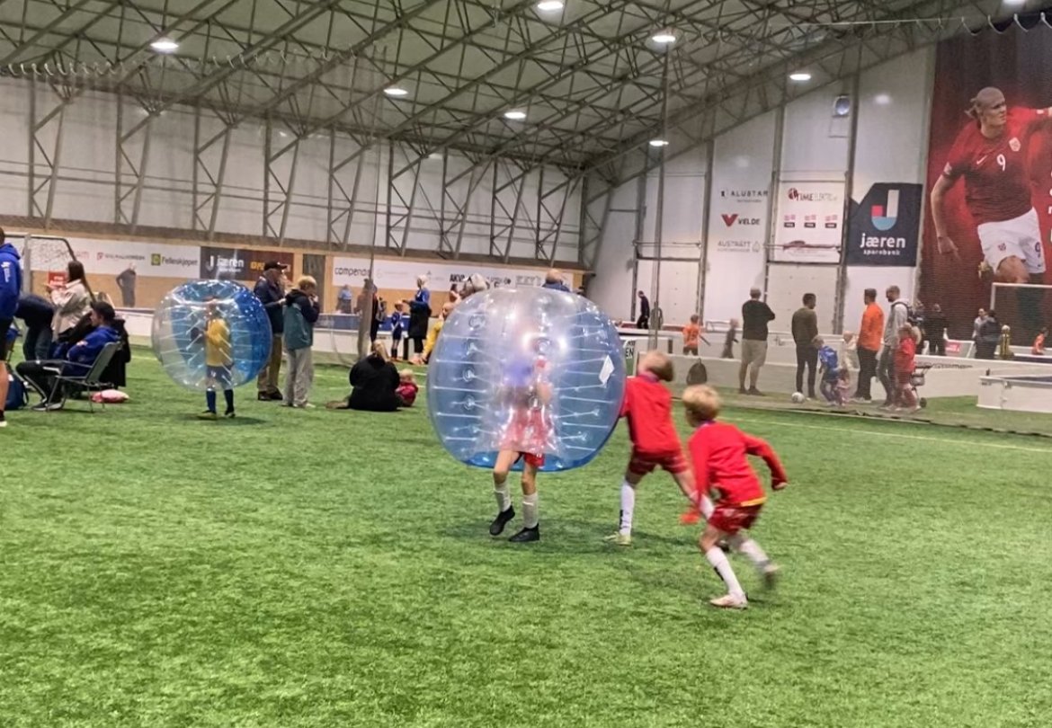 Siden det var så mange påmeldte lag, kom også grasbanen i bruk. Alle synes det var stas å få spille på en så flott bane! Det var i alt 16 baner fordelt på grasbanen, Aarbakkebanen og i Jærhallen: 6 binger med 3’er fotball, 5 5’er baner og 5 7’er baner.